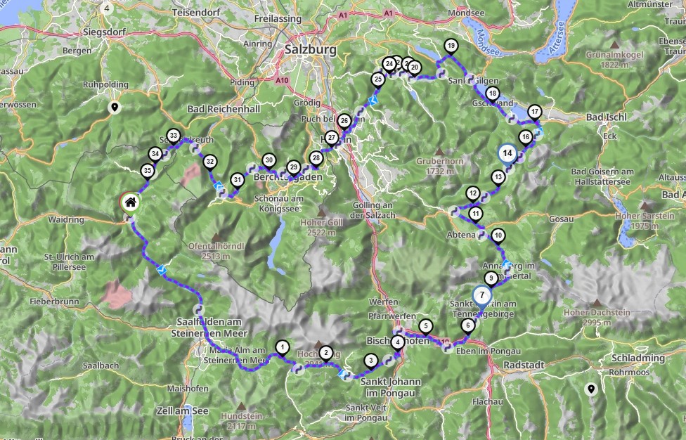Lofer – Saalfelden – Bischofshofen – Annaberg – Abtenau – Postalm – Wolfgangsee – St. Gilgen – Ebenau – Hallein – Bad Dürnberg – Berchtesgaden – Lofer