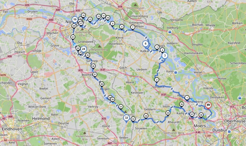 Schöne Rundtour am Rhein mit Zwischenstops am kleinen Strand (3) , Wissler See (6), Grote Markt in Nijmegen (19), Plasmolen (24) und einem Eiscafe in Arcen (32)